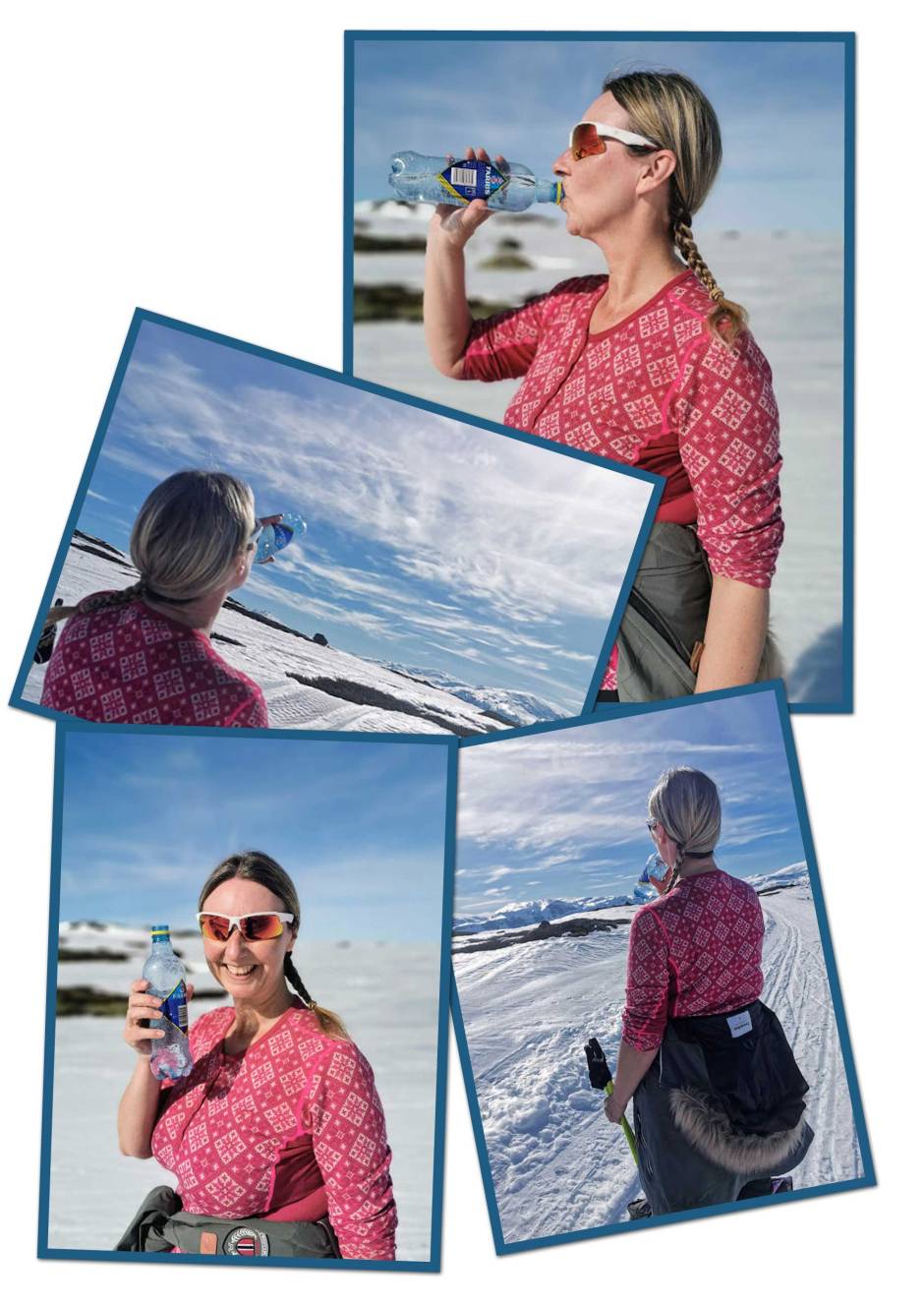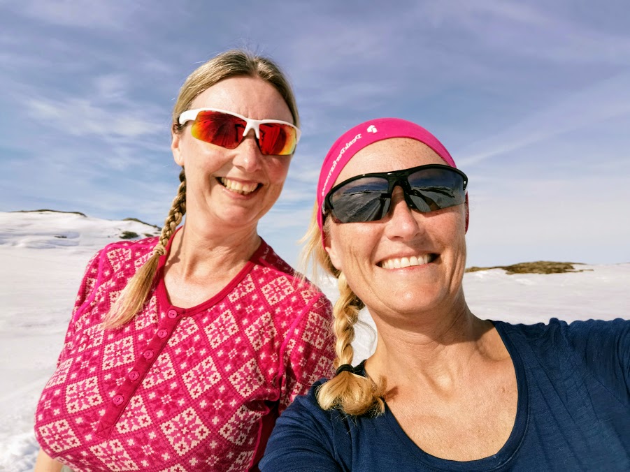 Mi jakke måtte av og hengjast rundt livet allereie i det vi stoppa for å ta skia på… Så gjekk vi ca. 200 meter før Marita avslørte at ho hadde to (2!) skibukser på!! «Ta av den eine!» kommanderte eg, så då vart det ei avkledningspause.