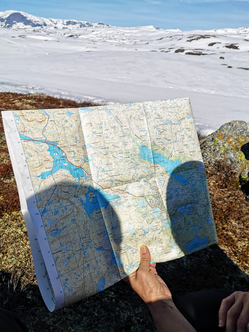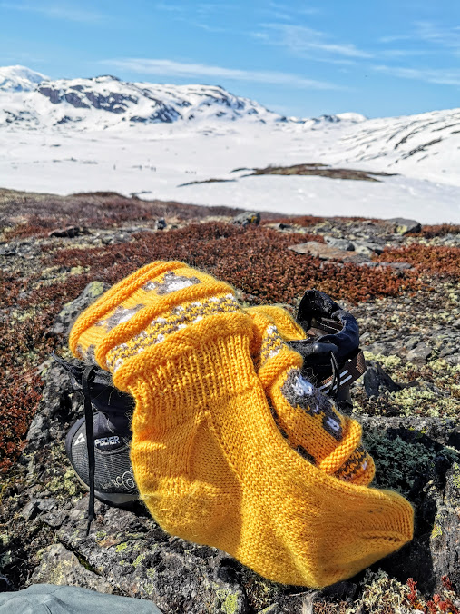 Vi ankom Haukeliseter ca. kl 11, noko som er passeleg tid. Sist vi var her gjekk turen på nedsida av vegen rundt vatnet. Denne gangen ville vi gå på oppsida av vegen opp på fjellet. Begge hadde sekker pakka til randen av alt vi trudde vi trong ha med oss og ikkje. Kven veit – brått kunne det jo koma eit veromslag??