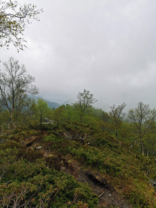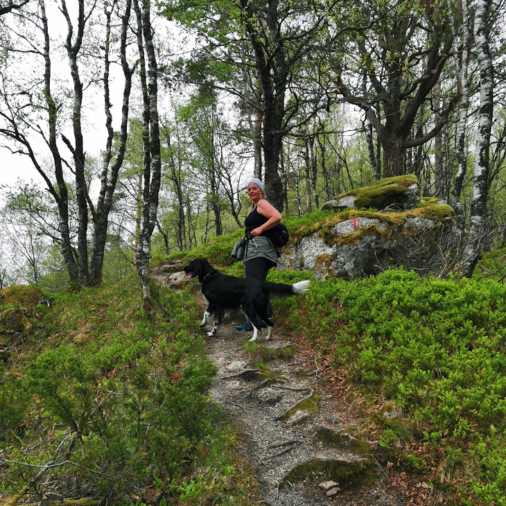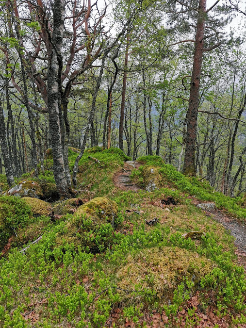 Her er Ann Irene og Frikken kome seg opp til stien. Det er grønt og fint – og MASSE blåbærkart allereie 🙂