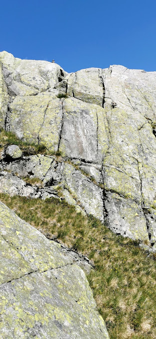 Men denne dagen hadde vi ikkje tenkt å gje oss her. Vi såg at på toppen av fjellet vi gjekk langs, var det og små vardar. Så då måtte vi koma oss opp i høgda. Sidan vi ikkje såg noko sti vidare her, gjekk vi rett og slett berre opp fjellsida der kor det såg greit ut å koma seg opp.