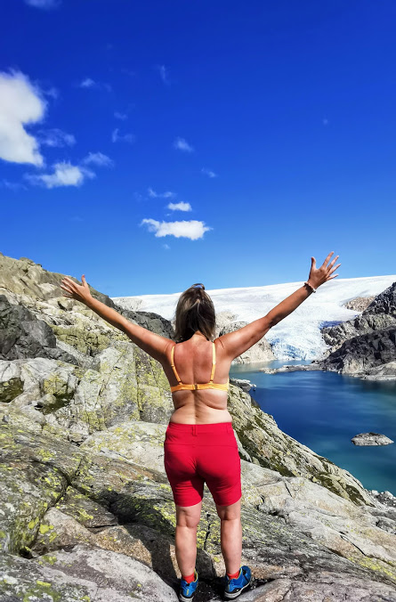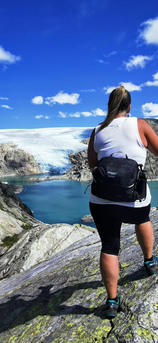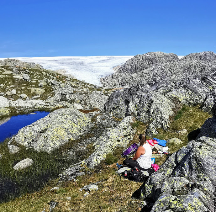 Ann Irene skuar mot Møsebreen før vi fortsatte turen vår.