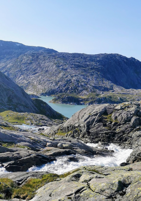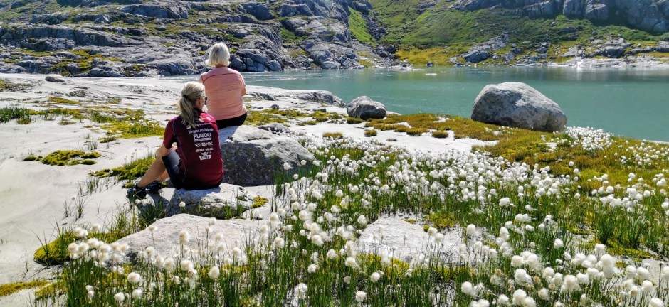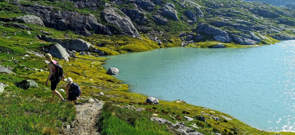 Å, endeleg flata det ut! Vi fann Lene og resten av ungdoman hengslengt langst vatnet. Her flata vi og ut, fekk av oss sko og sokkar, vassa uti vatnet og fekk avkjølt beina. Det var avkjølande og godt, men vi vassa ikkje så lenge om gangen – det var tross alt iskaldt brevatn. Damene i ungdomsgjengen derimot – vassa rett uti og dukka til halsen utan å utbryta så mykje som eit lite «brrr» eingang» Eg er imponert!!