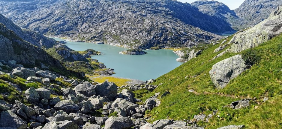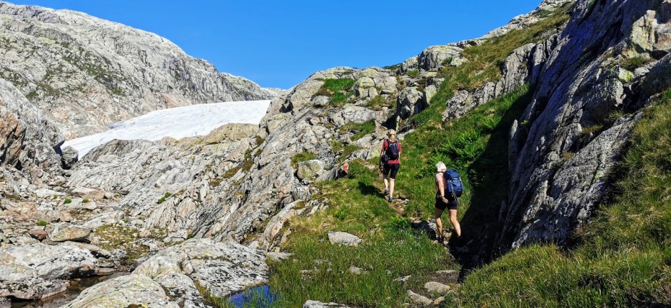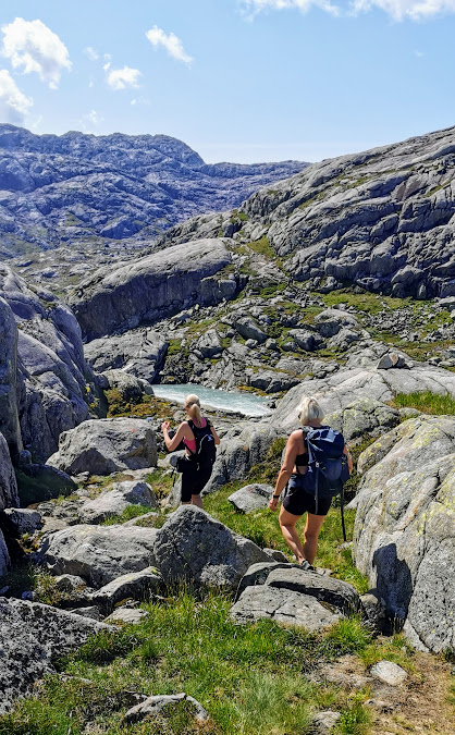 No har eg gått denne turen nokre gonger og kvar gong tidlegare har det vore litt gufse ver, og eg har aldri sluppet unna regn. I går vart det strålande ver og vi slapp å passa på glatte berg og steinar, gjørma og alt slikt som ein må passa på i dritver. Vi kunne berre labba avgårde og lot oss ikkje hefta nokon plass. Eg er faktisk litt usikker på om damen i det heile tatt registrerte at dei gjekk over berg der det var satt opp pålar med kjetting ein kan halda seg i….