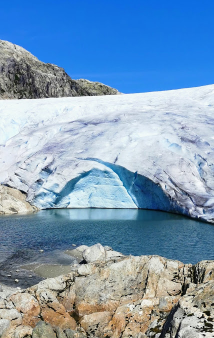 Vips og vips… No har eg gått denne turen nokre gonger, og eg synes faktisk ikkje turen inn til brea er så lang lenger. I det fine veret vi hadde i går, gjekk det jo og eindel raskare enn i dårleg ver. Lene og Kari syntes heller ikkje det hadde vore ein kjempelang tur. Men, no hadde vi enda ikkje byrja på tilbakevegen…..