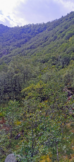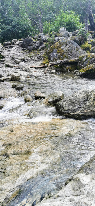 No kunne eg nesten ta ned på stranda, og vi hadde berre nokre meter igjen. Problemet var at «hovudstien» framleis gjekk på opp – og Ann Irene peisa på. «Hallo! Trur du ikkje vi no skal ned og ikkje opp?» Prøvde eg meg på. «Nei, du ser vel at det ser ut som om det er her alle har gått? Vi skal sikkert litt opp for å kryssa elva». Eg kikka ned og såg at eg kunne kryssa elva med to skritt, men kva visste vel eg, eg hadde jo aldri vore her før. Det hadde Ann Irene…