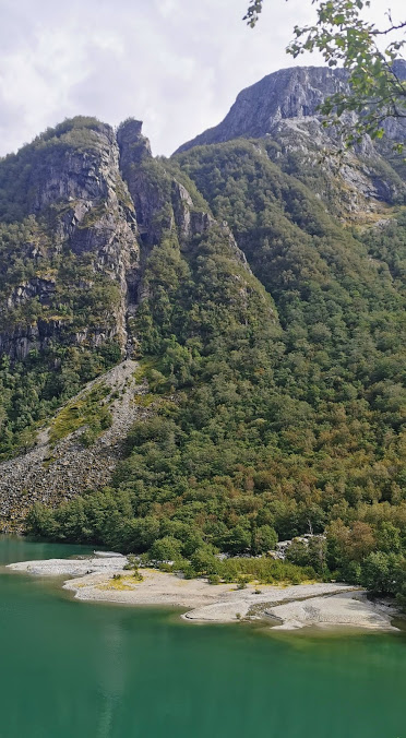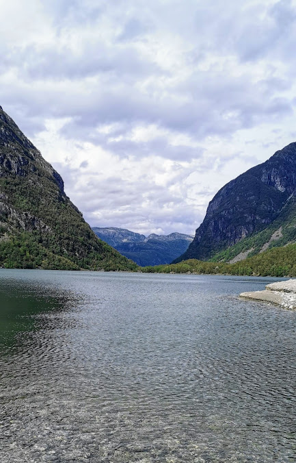 Vi kom oss trygt over, og kunne fortsetja turen mot stranda. Eg har ikkje noko godt svar på kvifor eg ikkje har vore så langt rundt vatnet tidlegare, men no var eg faktisk på ukjent grunn. Det var veldig fint på denne sida.
