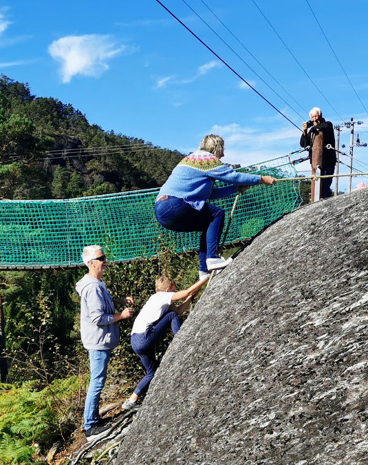 Blinkskot! Eg er jo så glad kvar gong eg ser eit tau eg kan klatra i 🙂 Det verste her er at eg ikkje kom meg ned! Eg trur eg valgte feil tau med for stor avstand mellom knutane 😉