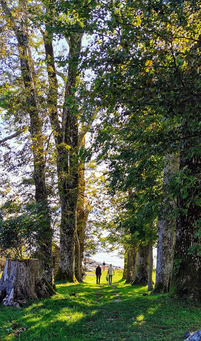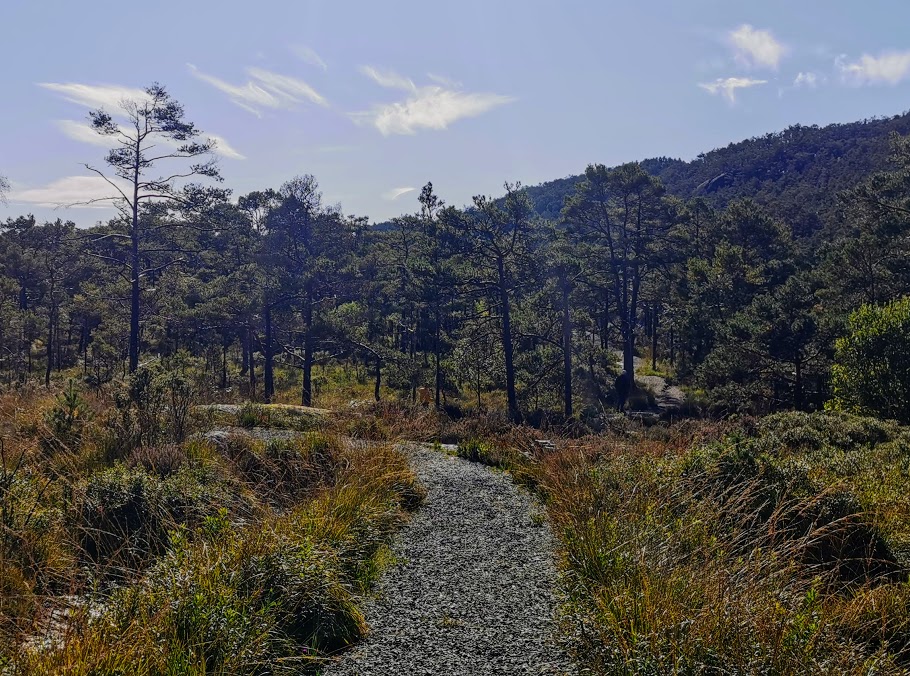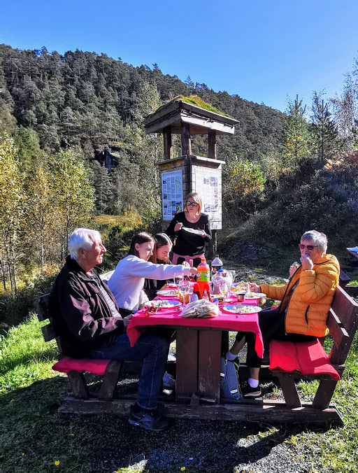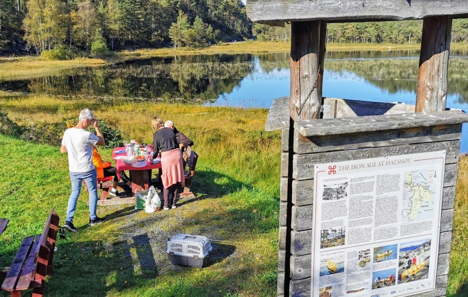 Det er satt ut mange bord og stolar rundt heile løypa, så ein kan nærast setja seg ned kor som helst. Her ved enden, før løypa svingar tilbake til parkeringsplassen, var det til og med ei bok vi kunne skriva namna våre i.