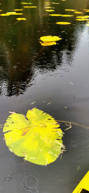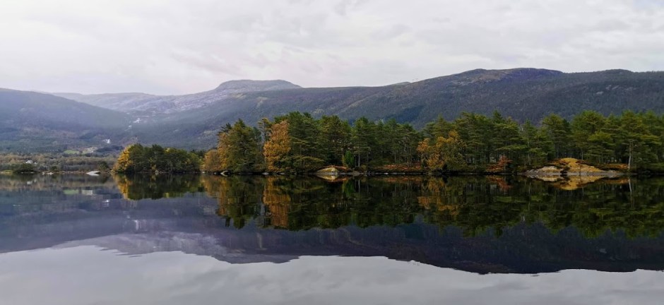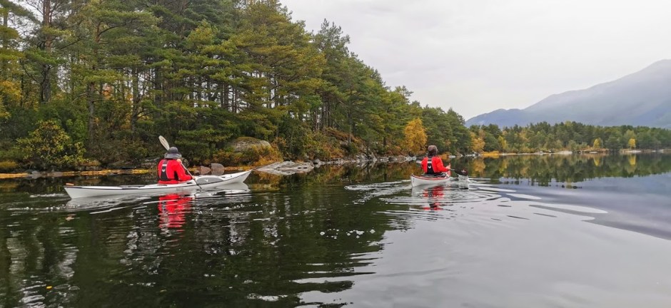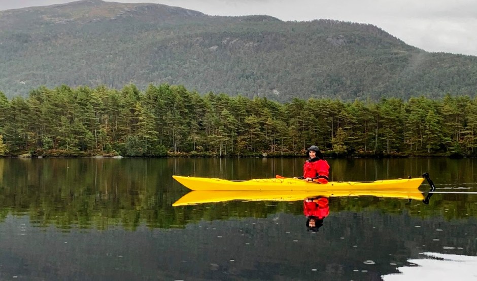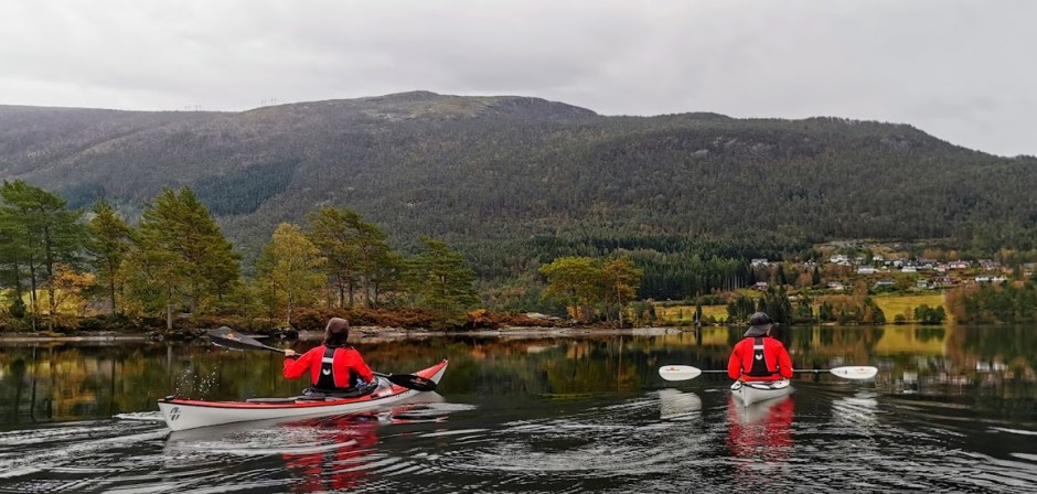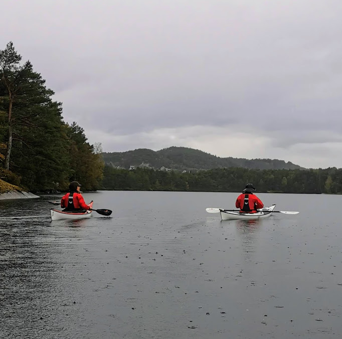 No har vi hatt nokre fine haustdagar med sol, men på fredag regna det sjølvsagt. Men det var vindstille, så då gjere det ingenting å padla i litt regn. Og så hadde jo Terese tatt ansvar – eg fekk utlevert både tørrdrakt og sydvest :-).