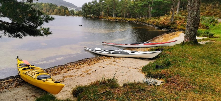 Vi parkerte ved rohuset ved vatnet. Der er det greit å koma seg i kajakken uansett om du vil leggja ut i frå stranda eller kaien.