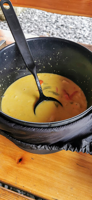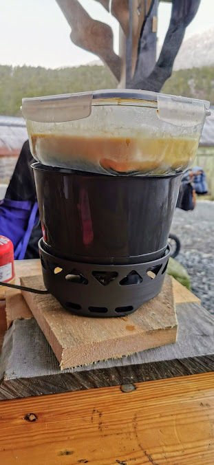 Vi rakk å få den både tint og kokt nett før vi gjekk tom for gass 🙂 Ikkje at det hadde vore noko krise, for pannekakesteikjarane tilbaud seg å setja igjen resten av sin gass då dei var ferdige med si matlaging 🙂
