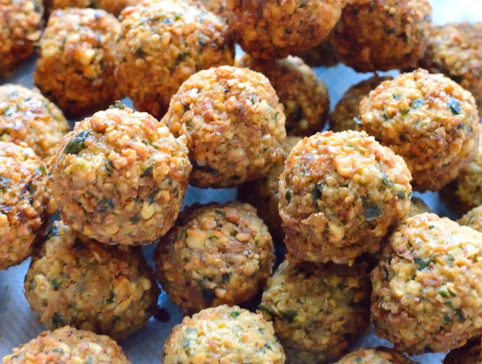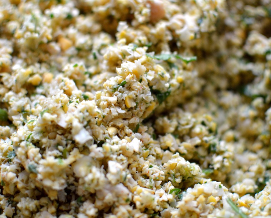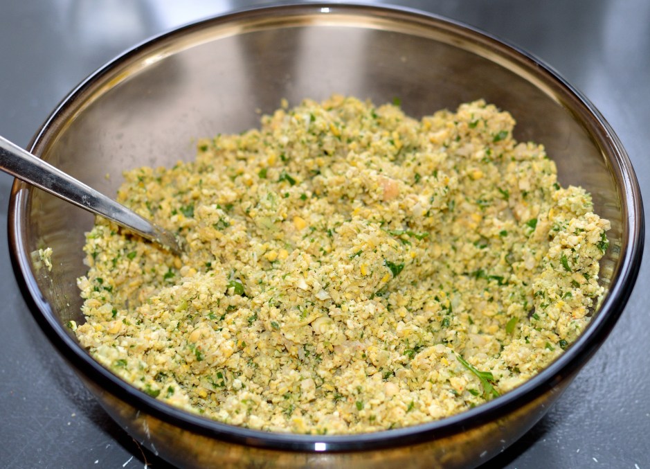 Så blandar ein i resten av ingrediensane: Bladpersille, koriander, løk, vårløk, kvitløk, salt, pepper, spisskummen, cayennepulver, bakepulver, potetmel og saft av ein lime. (Vil du ha nøyaktig oppskrift må du googla – eg tek det som regel på ein hytt. Og ja, med så ymse resultat)