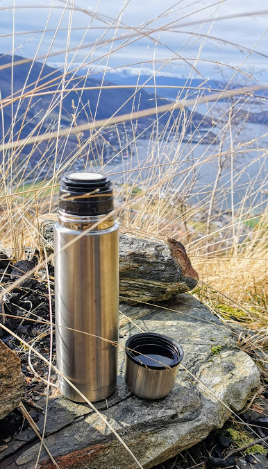 Det er stregt tatt ikkje naudsynt å ha med seg hverken drikka eller mat på ein liten pingletur som dette, men eg hadde jo i utgangspunktet tenkt meg på ein lengre tur. Så, ei solbærtoddypause i sola, vart det 🙂
