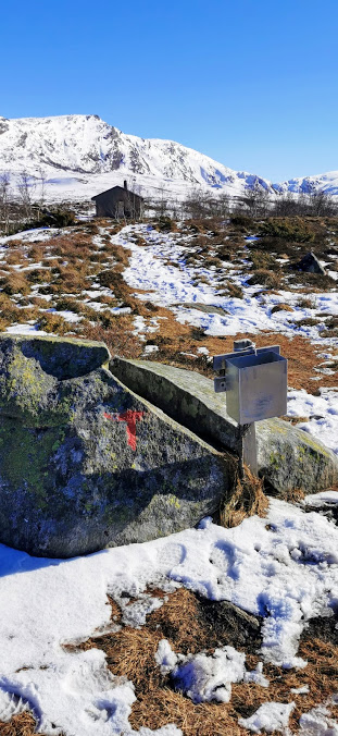 På Storhaug. Loket til postkassa er fordufta. Eg kan ikkje tru nokon har hatt brukt for det til noko, så det må vel vera vinden som har tatt det med seg. Den lefsa som framleis låg oppi kassa, frista det ikkje å skriva namnet sitt i, så eg lot det vera. Ein treng vel heller ikkje ta på alt ein kjem over i desse dagar… Eg veit jo uansett at eg har vore der 😉