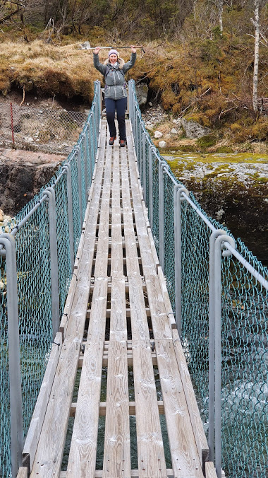 …hengebrua! Og mot alle odds (Jorunn plar ikkje vera glad i bruer) – den skulle ho over! Før eg fekk sukka for meg hadde ho kome seg midt utpå…