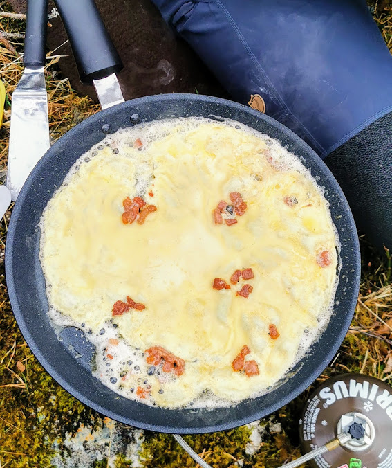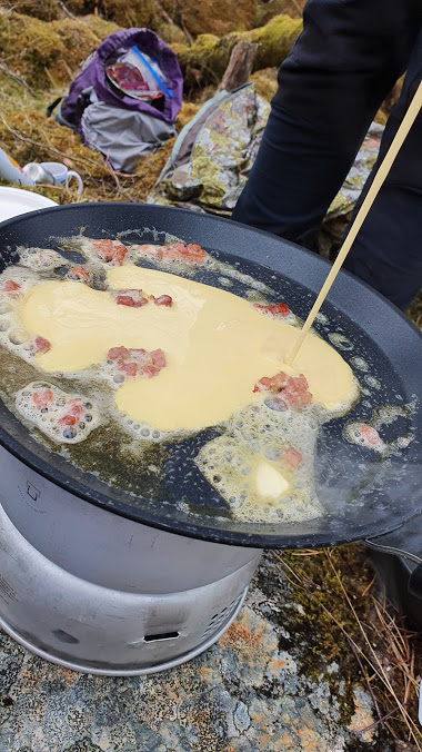 ….hadde oppi pannekakerøra (Jorunn hadde med ferdig steikt bacon)…