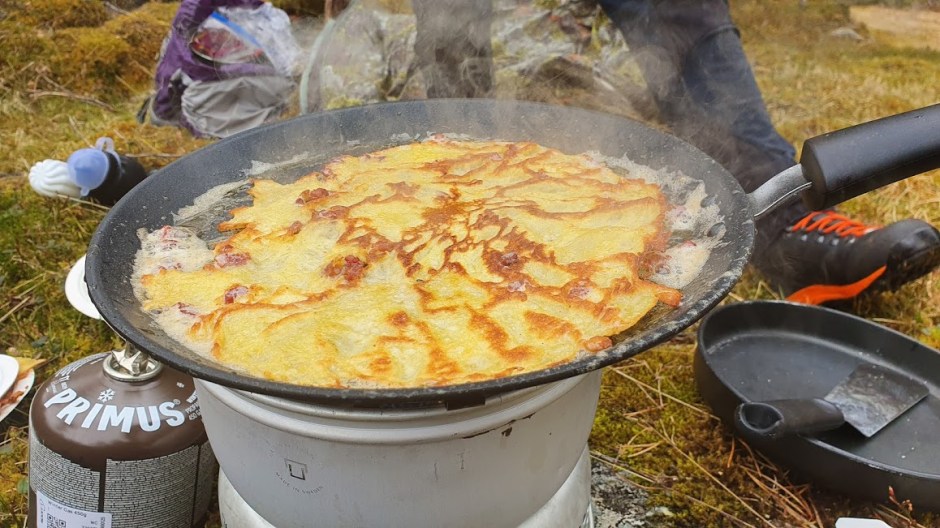 Pannekaker stod på menyen i dag. Jorunn har heile tida sagt at ho ikkje likar pannekaker, men eg har ikkje tal på kor mange gonger vi har hatt pannekaker på menyen på tur 🙂 Ho er ein «skap-pannekake-likar» 😉 Vanlegvis plar vi juksa og ta med ferdiglaga pannekaker, men i går hadde eg måtta mekka ei røra. Og dermed starta kurset i pannekakesteikjing 🙂