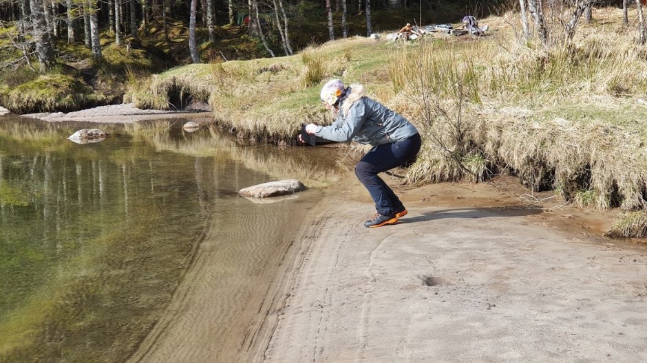 Det er ei fin flate nede ved elva som er fin å campa på – eg har til og med campa der i telt eingong. Men i går var det litt sur vind så nære elva, så vi fortsatte litt til. Vi hadde eigentleg berre tenkt oss litt lenger inn i skogholtet, men så fekk Jorunn auga på….