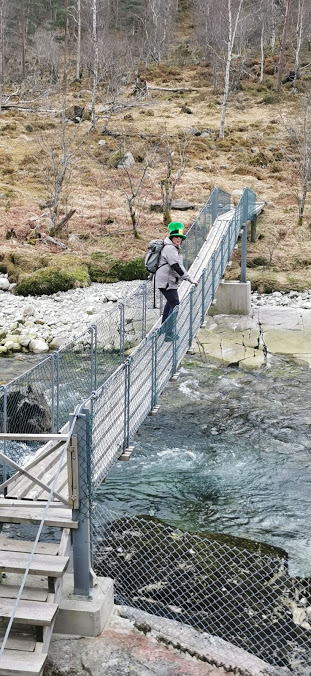 Og medan ho stod der med armane triumferande over hovudet, lurte eg på: «Er det no eg gjera ho oppmerksam på at denne hengebrua heng i hop med strips?? Og at dei fleste er øydelagt??» Akkurat i det eg tenkte det var best å venta til vi hadde kome oss over att andre vegen, peip det frå andre sida: «Har du sett, brua er stripsa – og dei fleste er øydelagt!» Der og då tenkte eg at der rauk den returen, no må vi gå ned att på «feil» side av elva, men det virka faktisk som om ho ikkje brydde seg om det. Kan det ha vore hatten som gav ho nytt mot??