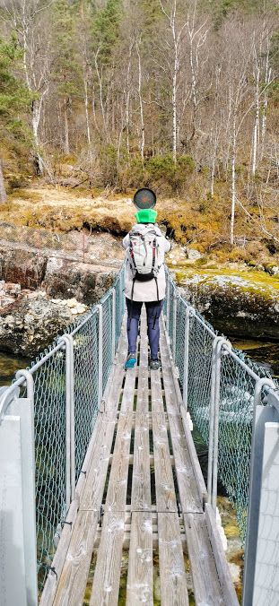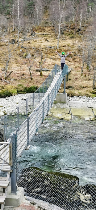«Sjå, no hands, no hands!» Eg måtte sjølvsagt tøffa meg litt når det var min tur til å gå over. Det er jo ellers ikkje så mykje eg er tøffare enn Jorunn på, og no ryk sikkert kategorien «gå over hengebru» og snart 🙂