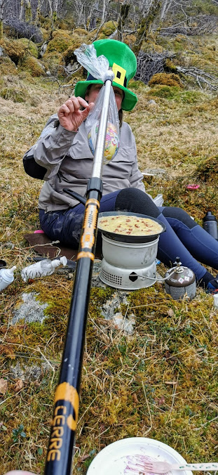 Det var faktisk litt snø i lufta når vi sat her, men i det vi pakka saman for å gå heimatt, då bestemte sola seg for å koma fram. Og då vart det både varmt og fint.