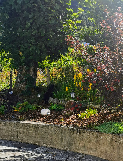 …..nabokatten, som heilt naturleg tok turen gjennom blomabedet mitt og forsvann gjennom gjerdet. Ser dåke han?