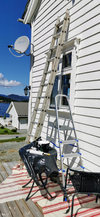Heile dagen hang eg ut loftsvindauga og mala dei øverste vindauga og stod i stege og gardintrapp og mala dei nederste. Eg hadde nok strøke på malarmeisterfagprøven med glans, men no har dei i alle fått eit strøk. Så får vi sjå om det blir opplett lenge nok til at eg rekk eit strøk til i august. Hvis ikkje får det venta til neste år – då får eg nok mala heile denne sida av huset uansett.