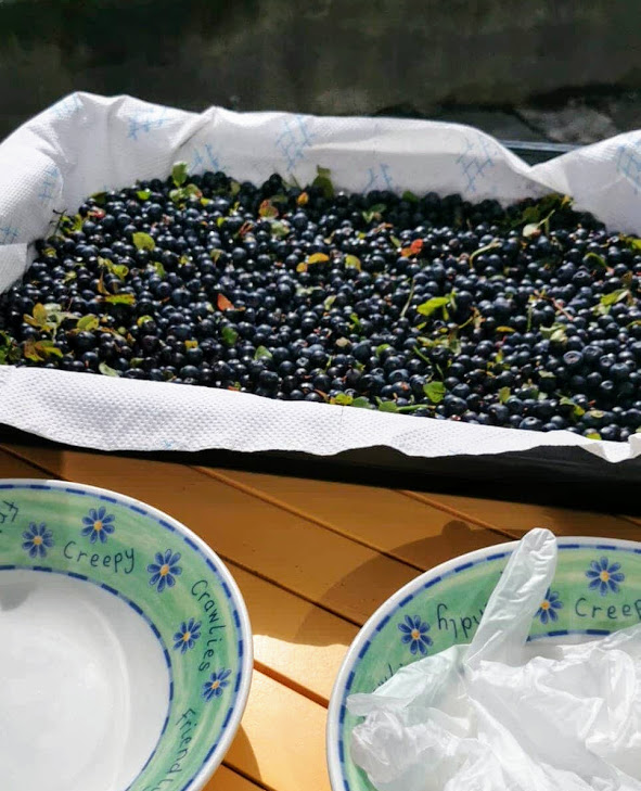Vi vart våte som kråker, men med nye tette regnkler og vanntette sko, gjorde ikkje det noko 🙂 Vi fann masse bær, og på eit par timar hadde vi plukka fulle dei boksane vi hadde med oss. Har ein sagt A, så må ein og seia B – resten av kvelden sat eg og renska blåbær 😉 Eg orka faktisk ikkje å gjera meg ferdig…