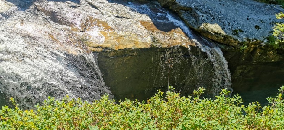 Den kom ned eit skar, og forsvann bak eit skar igjen – ville vi klara å koma så nære at vi fekk sjå heile «nedsida» av fossen?