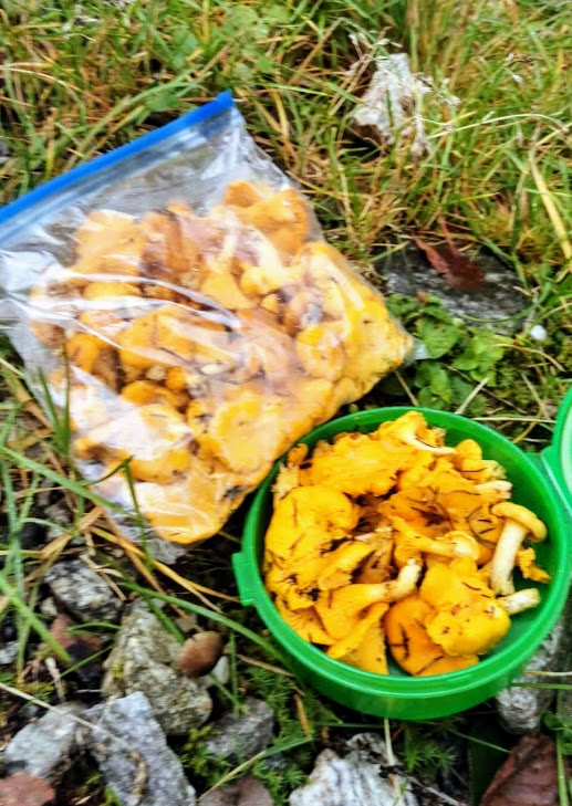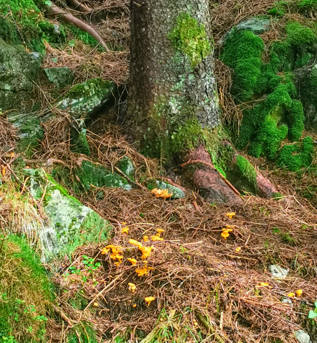 Eg kraup og eg klatra i til tider tett skog. Kantarellane skulle sankast for ein kvar pris. Ein plass måtte eg bøya meg på ein måte eg aldri hadde trudde min kropp kunne bøyast. Det kunne den vel forsåvidt ikkje heller – eg enda opp med eit realt hekseskudd i ryggen. Eg lot ikkje det stoppa meg….