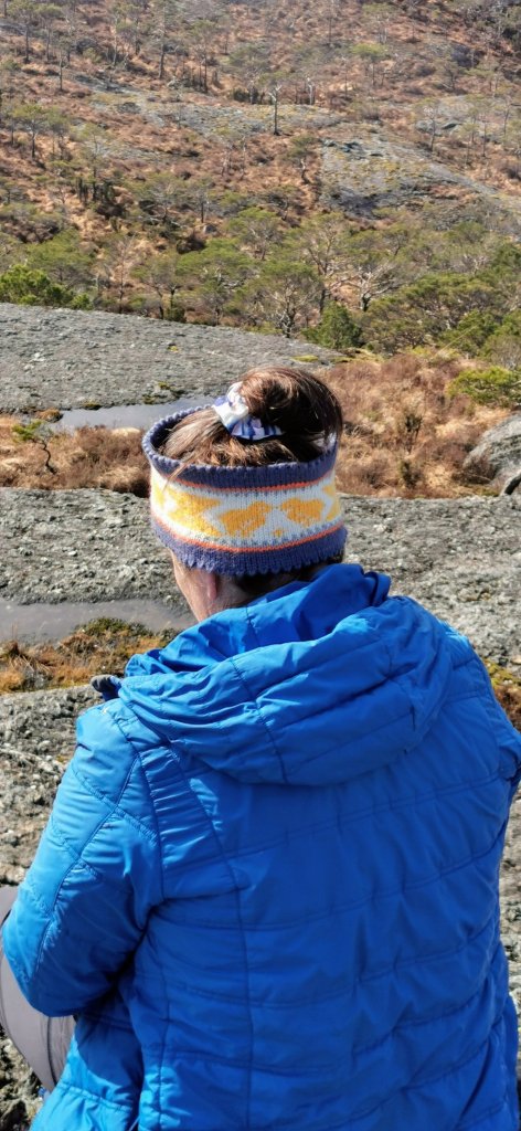 Men omsider måtte vi byrja å tusla nedatt frå fjellet. Det gjekk heilt fint, bortsett frå at vi ei stund var redd vi hadde mista Ann Irene og Per Ivar ein stad. Ekteparet, som har vore på Skorpefjellet utallige ganger, stod på toppen av eit berg og ana brått ikkje korleis dei skulle koma seg ned?? Dvs. dei kom seg ned mange ganger, men aldri der dei skulle! Per Ivar skraut veldig av kaffien deira på turen, og no byrja vi lura på om dei kunne ha hatt noko ekstra oppi den? 😉 Akkurat då eg var på veg til å gå tilbake og guida dei ned, fann dei utav det – dermed vart den Påskelabyrinten og løyst 😉