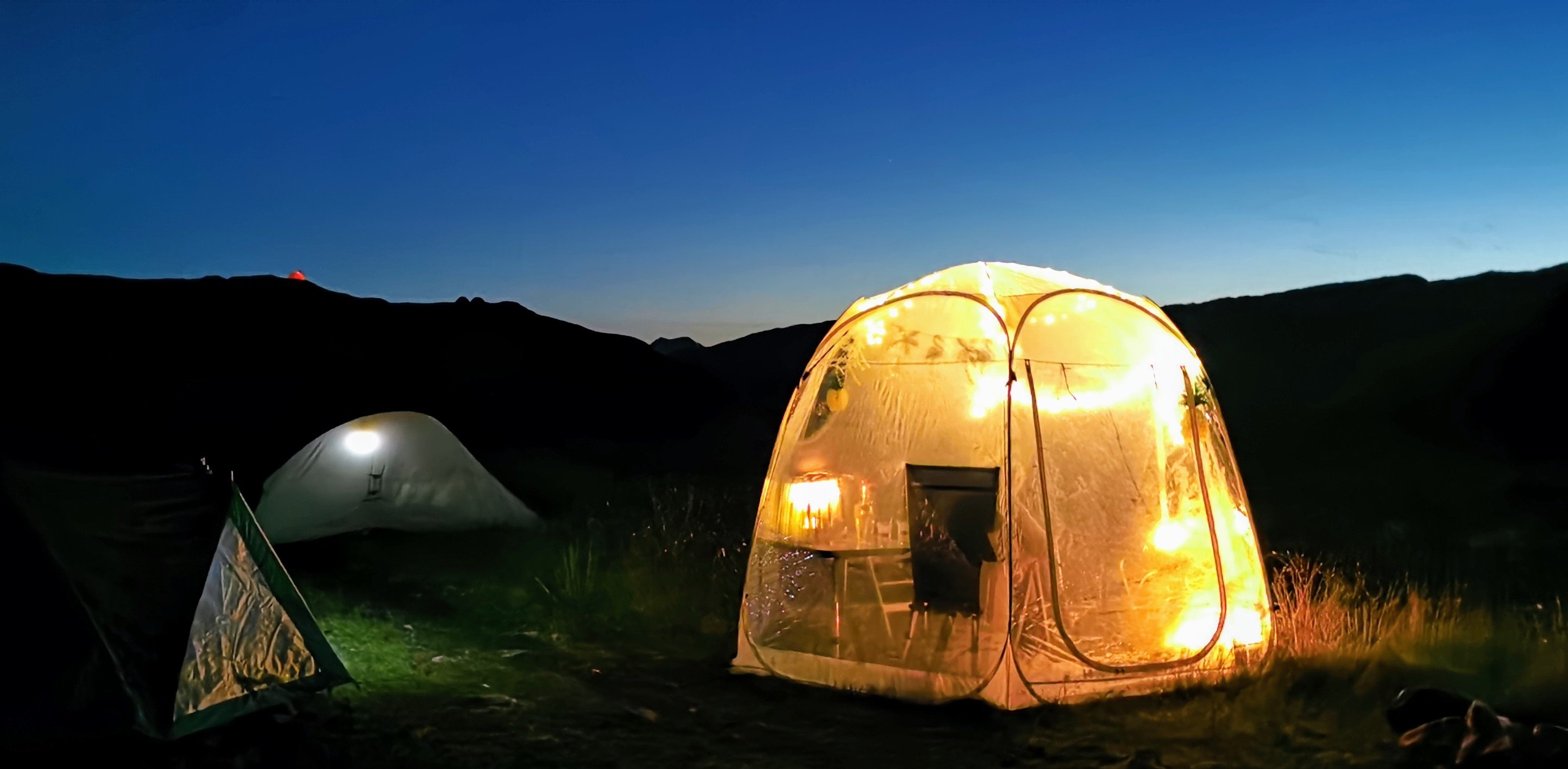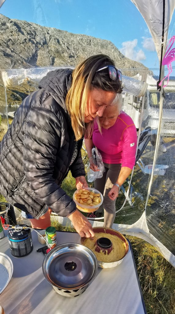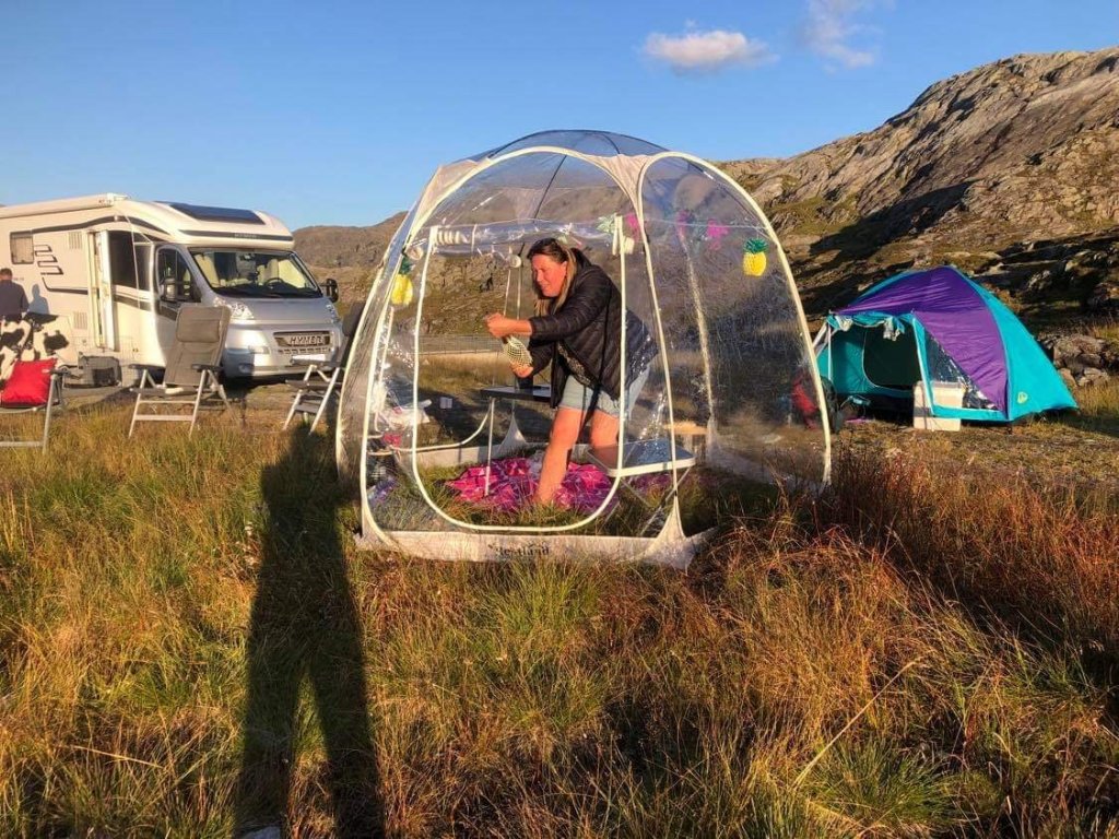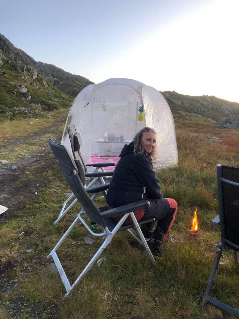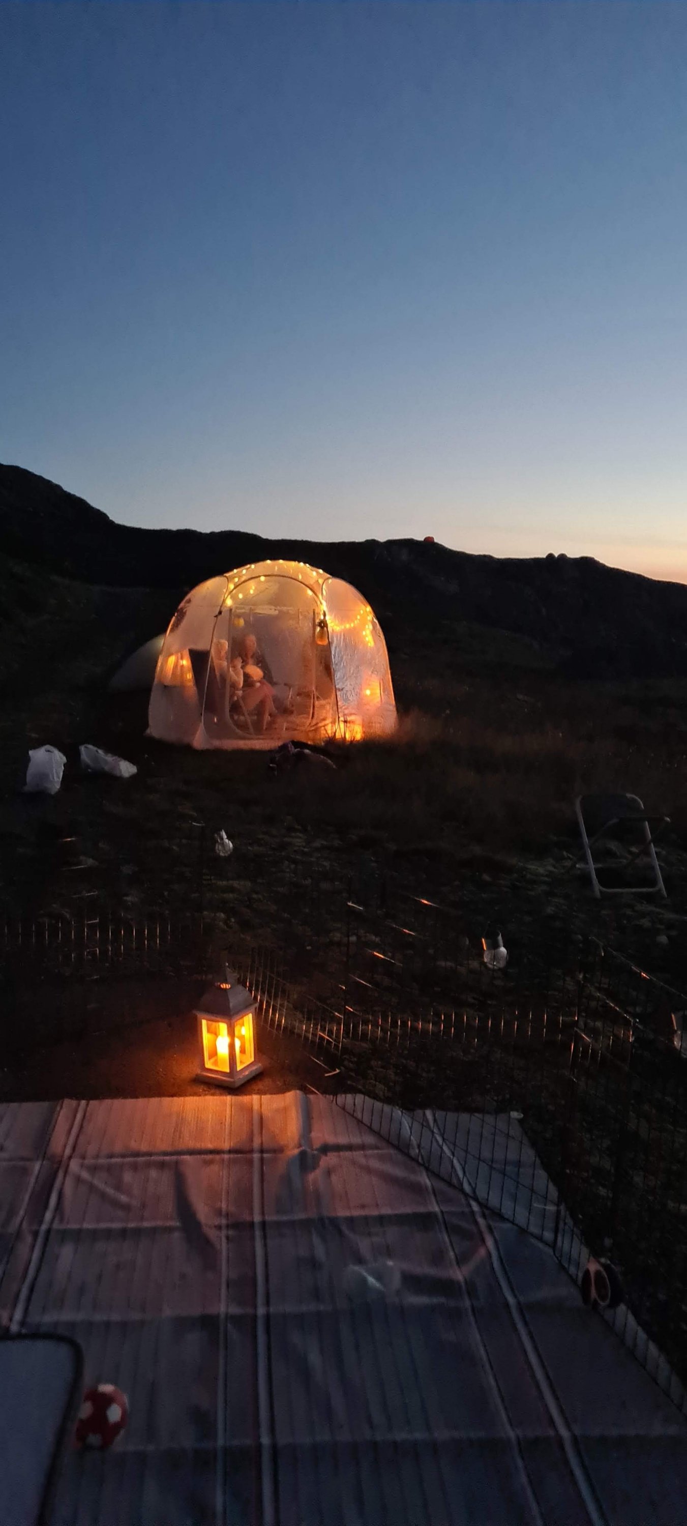 Eg hadde fått full friheit til å glamma opp teltet, og satt igang. Lyslenkjer, girlandere, lykter, pappfigurar – eg har aldri sett noko så jugglete nokon gong 🤣 Eg er forberedt på å måtta gje i frå meg glamsjefstillinga på neste tur…