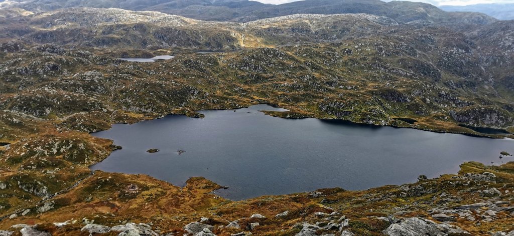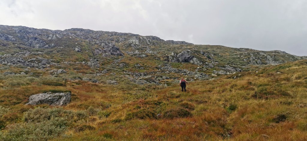 PĂ„ eit tidspunkt var HMS’en totalt frĂ„verande, og vi valgte Ă„ gĂ„ pĂ„ kvar vĂ„r sida av ein topp. Det er ikkje heilt Ă„ anbefala i dette terrenget – bratt, ur, stein, gras, fjell, hol…