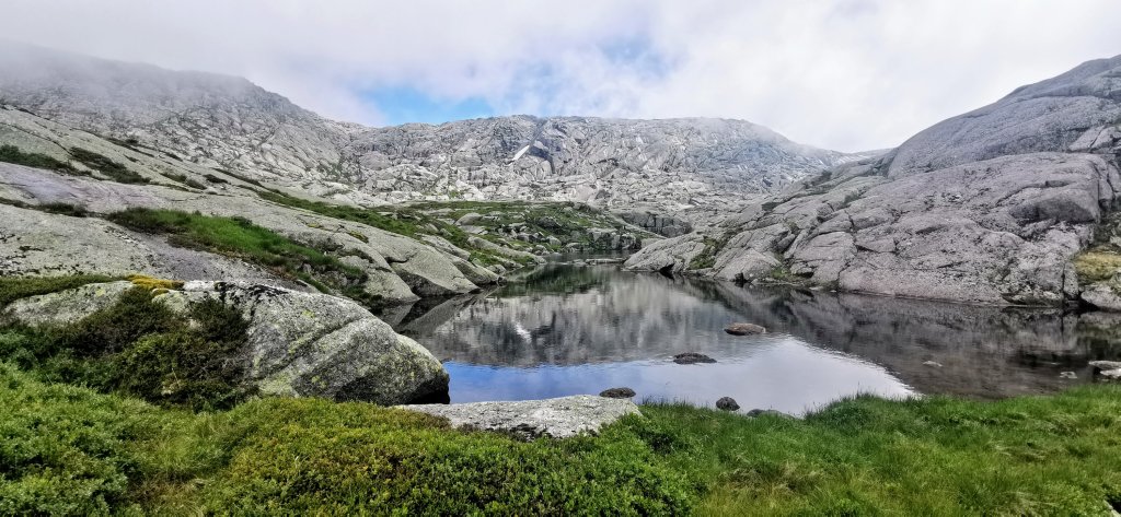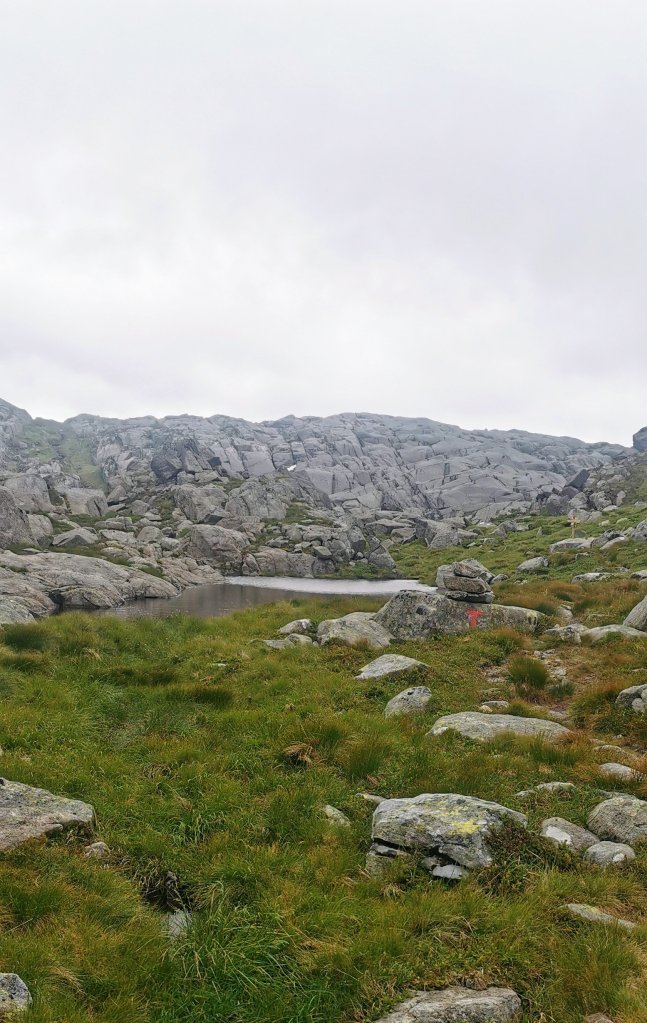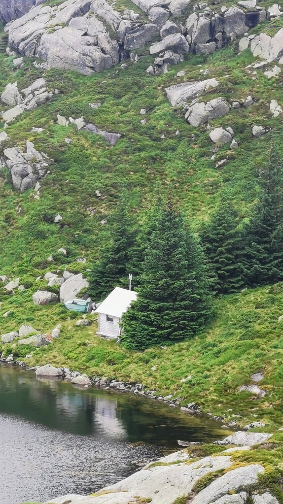 Det er fint i dette steinlandsskapet, men eg vart ikkje verande her så lenge i dag. Det bles rett og slett for kald vind her, og nett her er det ikkje så mykje le å finna. Så eg enda opp der eg rekna med eg kom til å enda opp – ved Eikehytta 😀