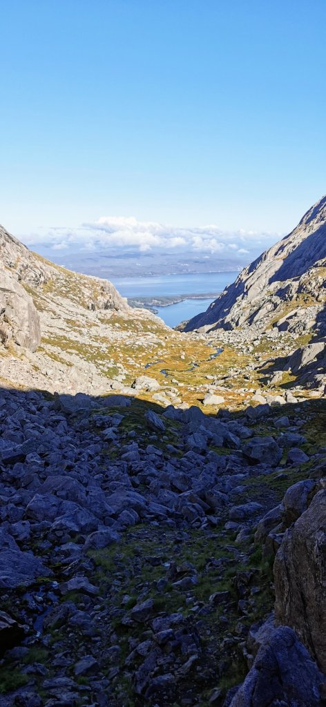 Det var skitlangt ned! Og det gjekk jo raskt opp for oss at etter å ha gått ut heile fjellkjeda og runda den, var vi no på veg TILBAKE heile fjellkjeda på nedsida. Er det mogleg – korleis kunne vi ha la oss lokka til dette?