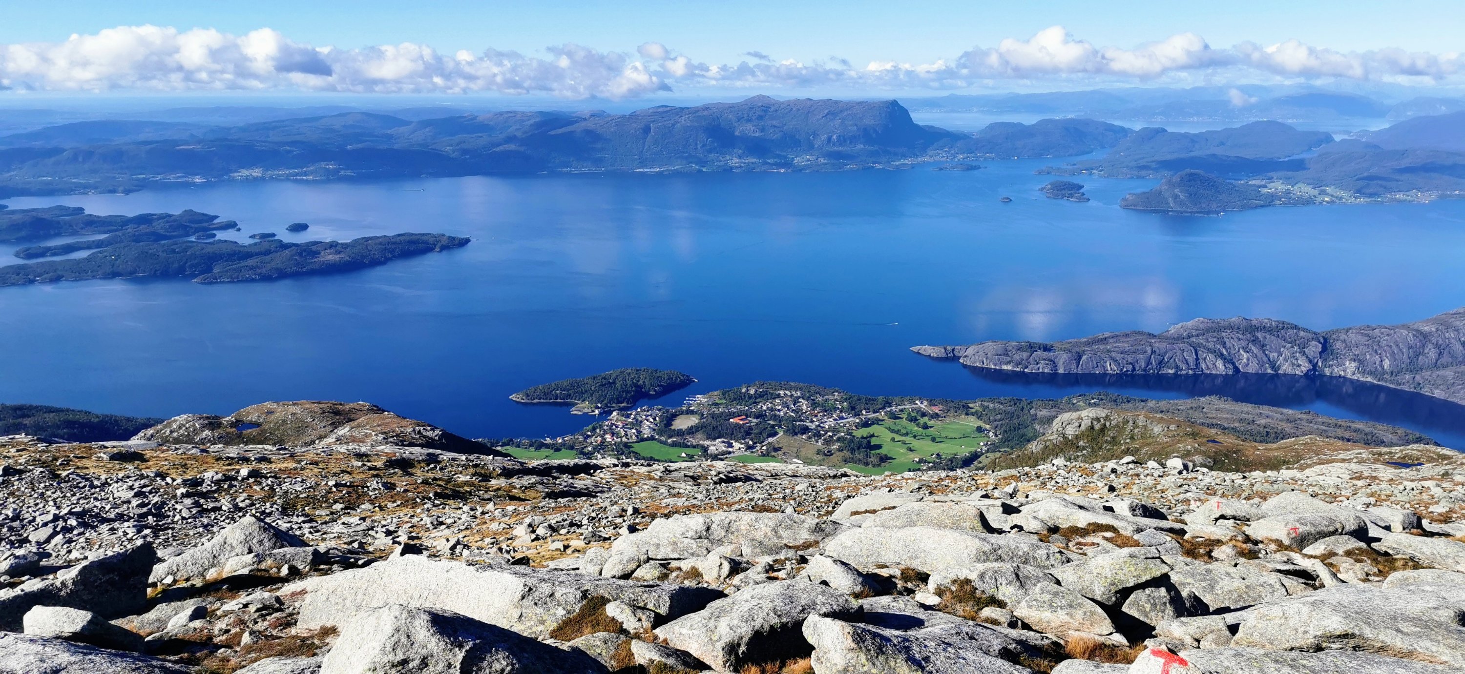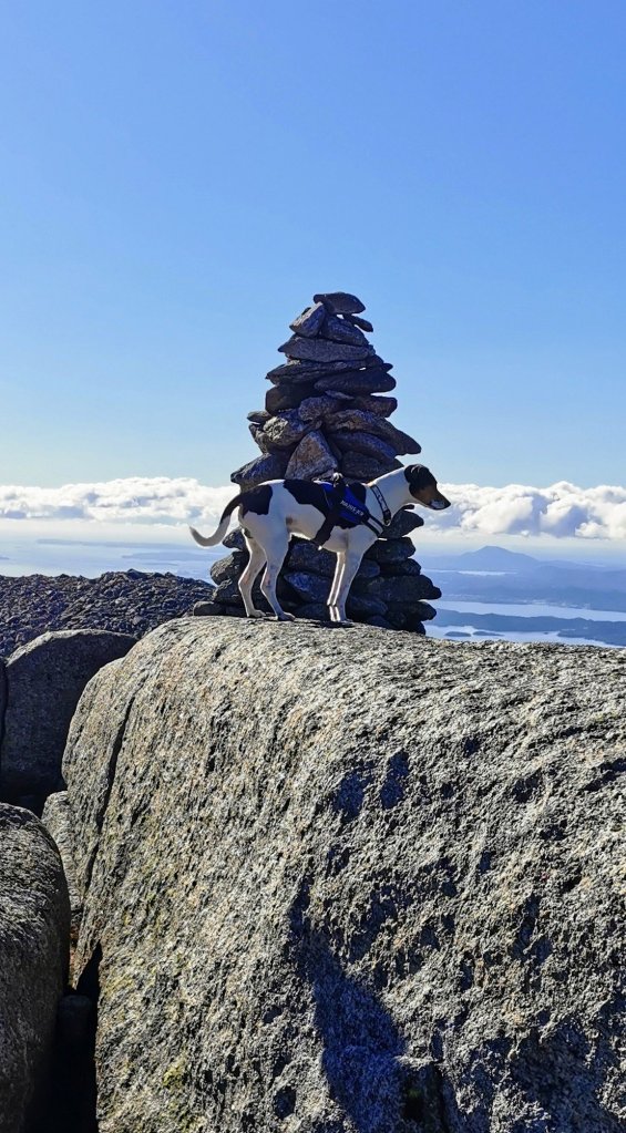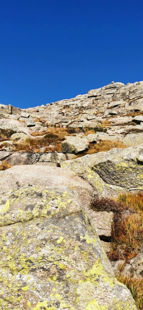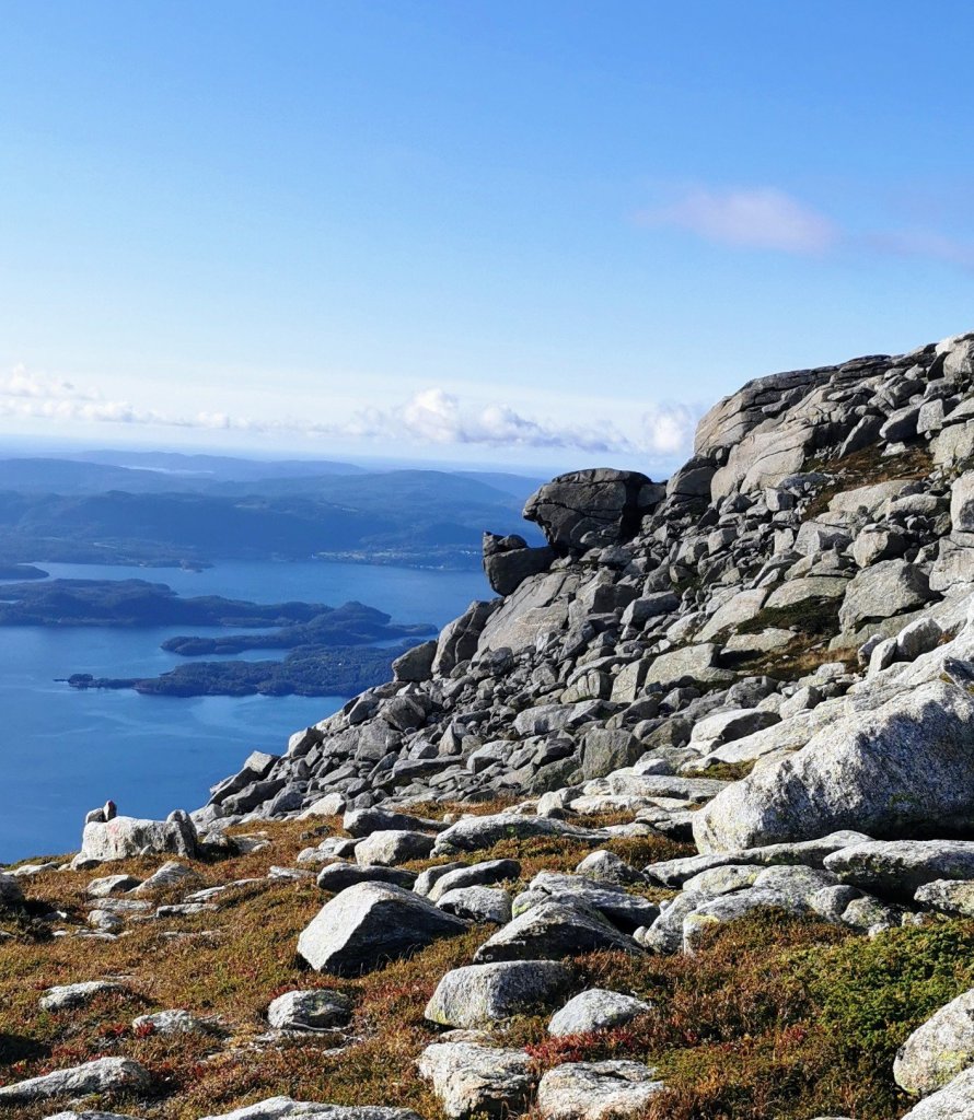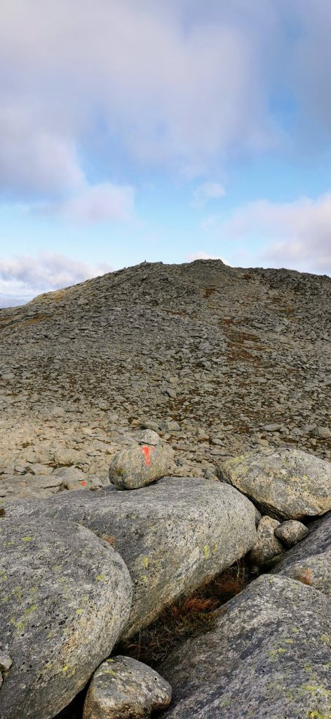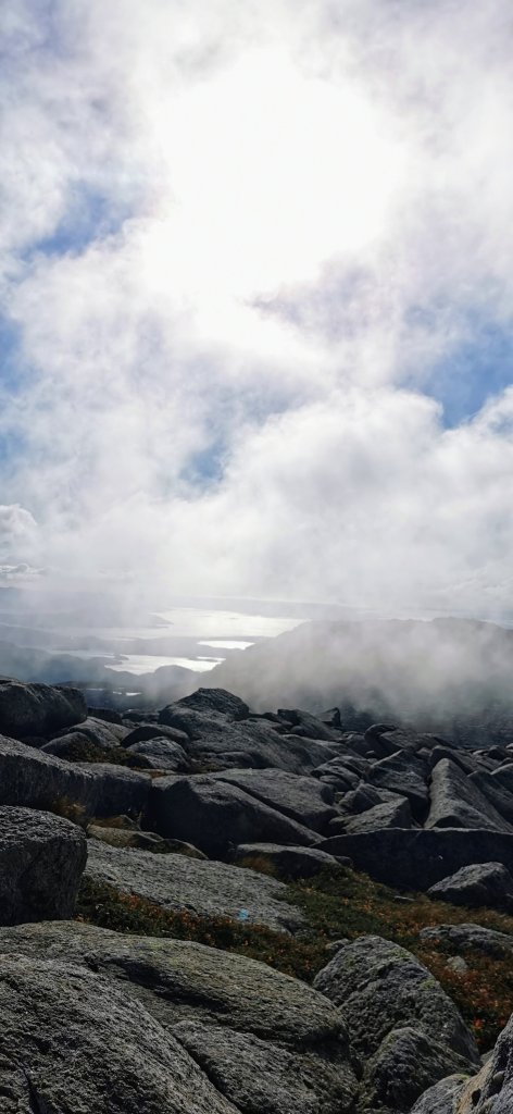 Om det var greit å gå her, så synes eg merkinga var litt dårleg. Vi måtte rett som det var stoppa opp og kikka rundt oss for å speida etter ein raud T eller prikk. Vi skal vera glad skodda forsvann att, ellers så hadde vi vel surra rundt der oppe enda. Noko særleg synleg sti var det jo heller ikkje i steinrøysa.