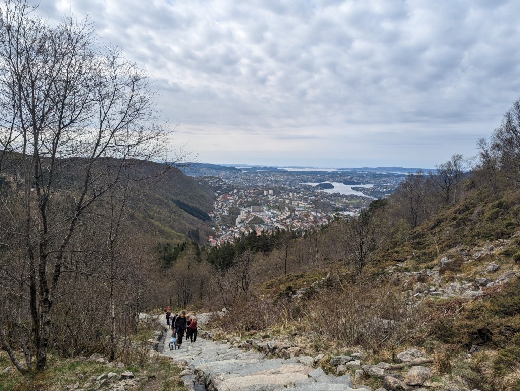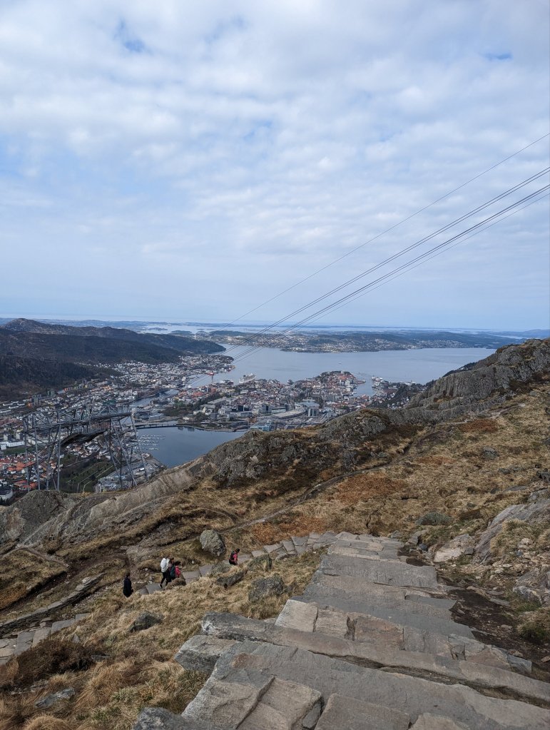 Men vi skulle jo ikkje berre beundra trappene – vi skulle og gĂ„ dei opp. Eg trur ikkje eg hadde gĂ„tt sĂ„ mange av dei 1333 trappetrinna fĂžr eg syntes det var tungt đ€Ł Dama frĂ„ GjĂžvik med ein halvmeter kortare bein enn oss to andre, forsvann oppover som om ho aldri hadde gjort noko anna. Dama frĂ„ Bergen haldt nesten fylgje oppover. Eg kom pesande etter og sĂ„g med lengsel pĂ„ Perle og Bruse nĂ„r eg fekk dei i augesyn no og dĂ„ đ Eg er forresten usikker pĂ„ om dei nye gondolbane har desse gamle namna?