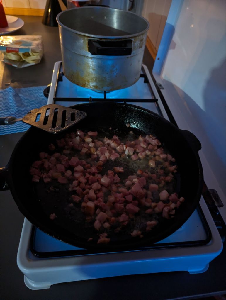 Vi hadde ein plan om å prøva å halda vedomnen i gang i løpet av natta. Eg er usikker på om om vi fulgte den, men eg heiv meir ved inni kl 01, Magnhild kl 03, så rørte vi vel ikkje omnen før vi stod opp i halv 8- tida. Då viste det framleis +11 grader i hytta, og det var vi veldig nøgd med 😀