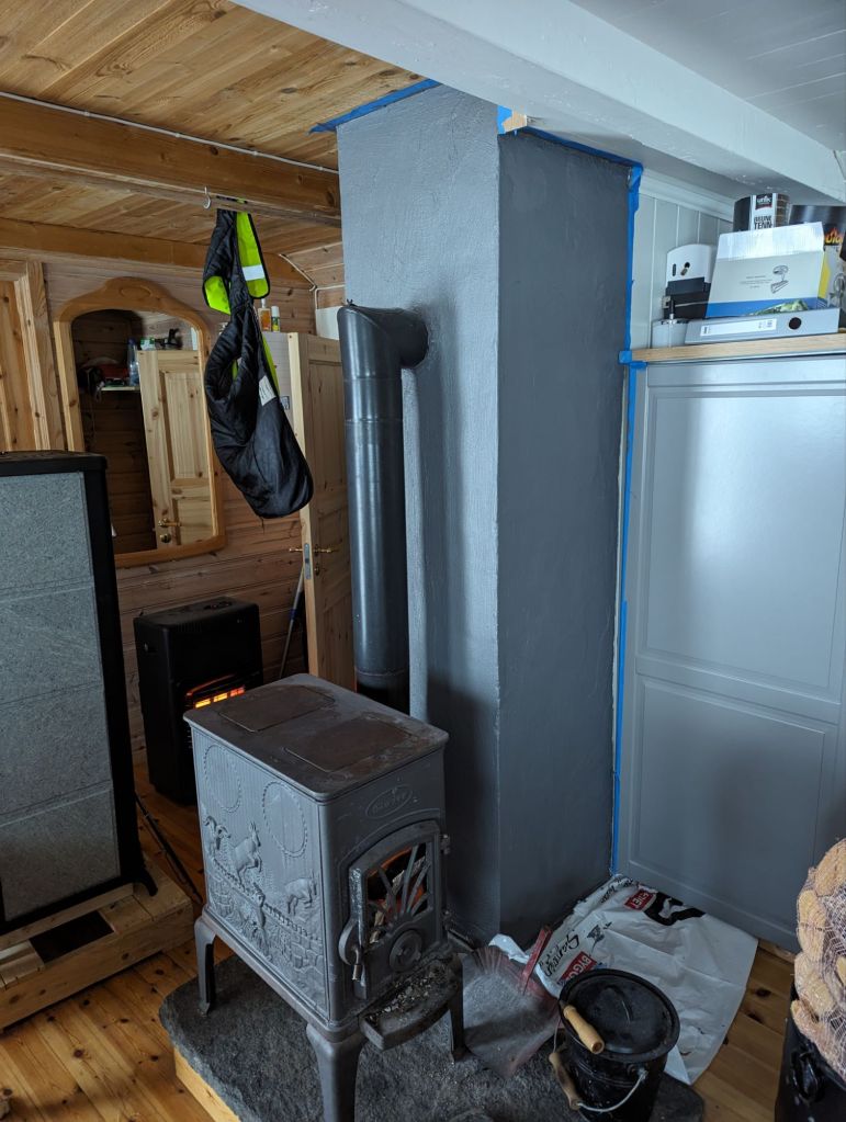 Temperaturen steig i hytta – fyrst måtte ullgensaren av, så forsvann dunskjørtet, av hensyn til Magnhild måtte eg behalda ullundertøyet på 😀 Når temperaturen viste mellom 16 og 20 grader (alt etter kva ende av hytta ein var i), slutta vi å fylgja med. Det virka som om all fuktigheten i hytta samla seg på pipa, så det tok ei stund før den vart tørr nok til å byrja mala eit strøk.