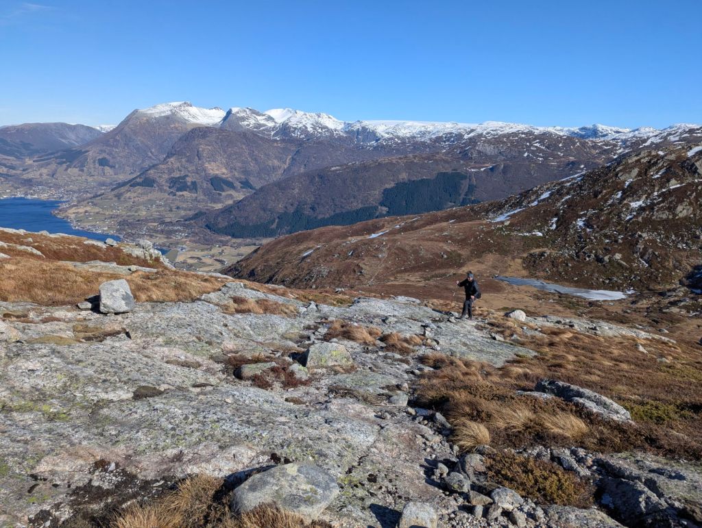 Vi var lei begge to ned denne siste fjellsida. Ryggen verka og det eine kneet byrja bli kranglete. Det positive var at det var heilt vindstille!!! Kva fader – heilt vindstille!!! Og varmt – veldig varmt🌞🌞 Nesten så vi gløymte at vi hadde streva oss opp og over eit fjell i full storm – det var meldt 26-27 ms i kasta i dag – det virka som meir🤣🤣 Og det var slett ikkje kast – men ein vegg av vind💨💨💨